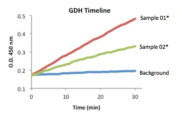 | Principle【原理】 | 通過偶聯酶試驗可測定 GDH 活性,其中谷氨酸被 GDH 消耗,生成 NADH,NADH 與探針反應生成與 GDH 活性成比例的比色 (450 nm) 產物。一個單位的GDH 在37℃下pH 7.6 時 每分鐘將產生1.0μ摩爾NADH的酶量。 |