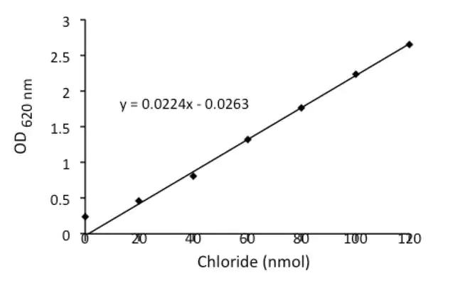 | Principle【原理】 | 氯化物檢測試劑盒可簡單、直接地測定各種樣品(包括血液和尿液)中的氯化物含量。該試劑盒通過Hg2+ 和Fe2+ 對2,4,6-三(2-吡啶基)-s-三嗪(TPTZ)的競爭反應,確定的氯化物濃度。首選的Hg-TPTZ復合物是無色的。在氯化物存在下,Hg2+ 形成沉淀物HgCl2,從而使TPTZ能夠與Fe2+絡合。Fe-TPTZ復合物產生的比色(620nm)產物與樣品中的氯化物含量成比例。 |