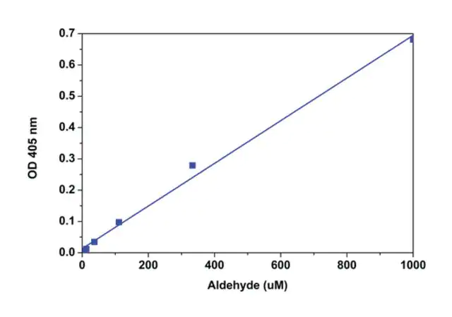 | Principle【原理】 | 比色醛測定試劑盒為測定多種樣品中的醛提供了簡單直接的程序。醛與染料反應,產生比色產物(405 或 550 nm),比色產物與存在的醛量成正比。比色醛測定試劑盒的檢測下限為 1 納摩爾醛/100μL分析體積。本試劑盒用于監測將氨基轉化為醛基的氧化酶的活性。 |